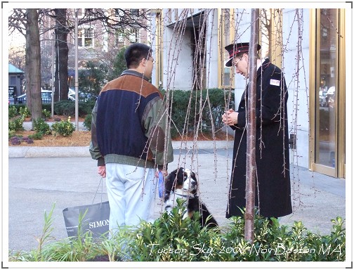 某間店前,帶著狗狗等女伴從店裡出來的男士與幫客人開門的服務生。狗狗實在是很可愛,所以連服務生都跑來跟狗主人聊天,這種穿著厚厚黑尼龍長大衣的開門先生還真的是得在寒冷地方的精品店或飯店才有得見呢!