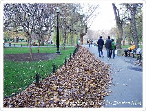 波士頓Public Garden。很漂亮的一個公園,也是波士頓主要的觀光景點之一。滿地的落葉都被掃到路邊,這樣厚厚的沿路堆起,也是風情。公園裡頭很多松鼠,不怕人的在遊客腳邊竄來竄去,如果你有帶麵包來,還可以順便餵松鼠呢!