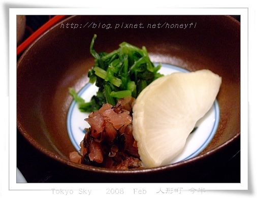三人的醬菜都長這樣,不愧是高級餐廳,醬菜都很有水準、好吃又高雅。和式的餐廳用餐一定會附贈醬菜一皿,高級的醬菜味道極美,口味溫潤又很有深度,嘗試各家密傳待客的醬菜已經是我們外食時的功課之一了。今半的醬菜絕對是一流的!