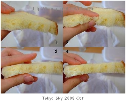 最神奇的是這款麵包的彈性。看看下面這張圖就可以知道,用手指用力壓捏麵包,還是會彈回來。當然、我並沒有加什麼不該加的東西,所以很神奇啊!