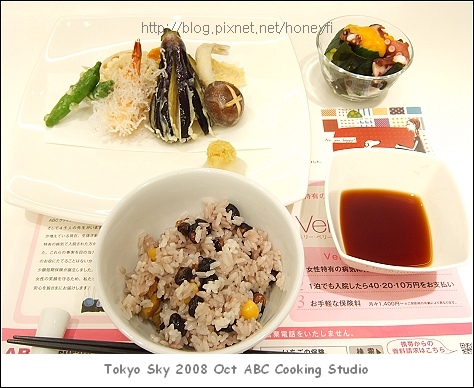 這個月ABC的和食menu是天婦羅定食,拿來炸天婦羅的是秋天的食材、香菇、蓮藕、秋茄子、還有蝦子和青辣椒等材料,飯是用栗子和黑豆一起煮的栗子飯,也非常有秋天氣息;配菜是醃章魚和小黃瓜配上蛋黃醋醬,三種都是我很少做的料理,所以很新鮮。