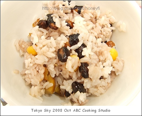 栗子飯是我最喜歡的一個部份,作法也簡單,只是把栗子(糖炒栗子那種熟栗子)和黑豆放到飯鍋裡頭和白米一起煮,用一般煮飯的程序就可以了,栗子飯剛煮好時香氣四溢,吃起來甜甜香香的,很秋天。