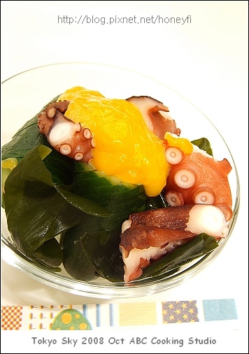 配菜的醃章魚和小黃瓜新鮮就很好吃,另外加上蛋黃醋醬感覺雖然不錯,不過醋味稍微嗆鼻了些、蛋黃也多少有點腥味,所以我不是很敢吃。不過至少章魚跟小黃瓜都已經先用鹽入味,本身就很清爽夠味了,直接吃也沒有什麼問題。