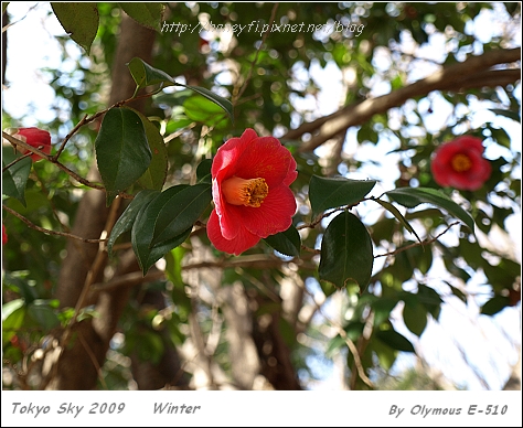 梅花樹林旁還有一顆很大的山茶花,高高的山茶花樹很有氣魄,雖然山茶花沒有香味、花落時又很不堪(註),但我卻很喜歡她孤高的、熱情卻又含蓄的姿態。