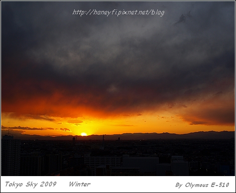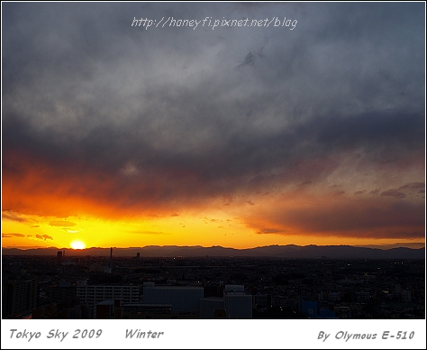 快晴一整天,到了傍晚開始出現一大片烏雲,原本以為看不到夕陽的,結果太陽靠近地平線之後反倒穿雲而出,光線與雲層組合出這樣神秘詭譎的風情。
