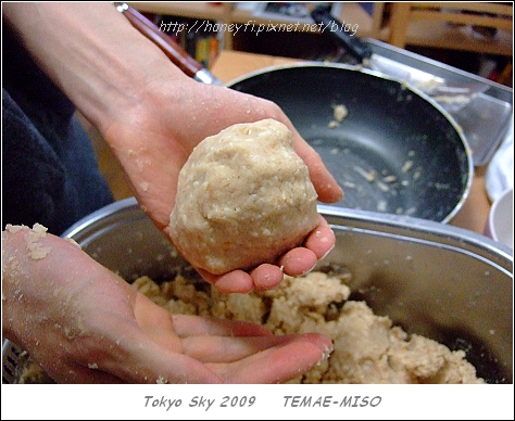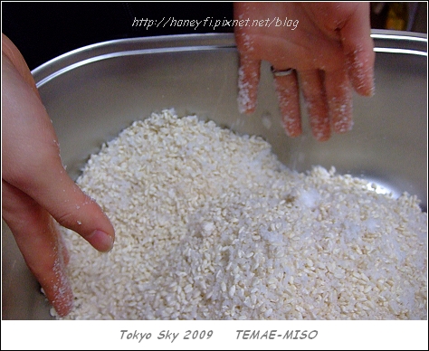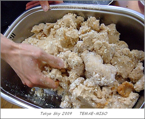 8.將壓好的黃豆放入混和好的米麴與鹽中,並加入剩下的種味噌,輕輕攪拌至均勻,拌好的味噌應該要是溼潤柔軟的狀態,若不夠軟,中途可加3-6大匙的種水調整(我加了約10大匙,應該是因為攪豆泥的時候沒有加的關係,所以比較乾)。柔軟度測試方法是小拇指可以輕鬆插入的程度。