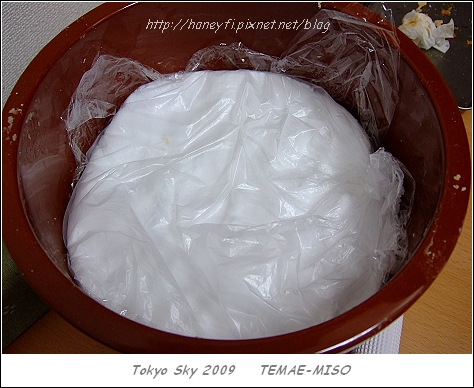 10.將保鮮膜蓋在味噌上,務必完全與味噌密合,不要有空氣接觸,才不容易長霉。之後蓋上鹽袋作成的重石,稍微調整一下使鹽均勻蓋在味噌上。