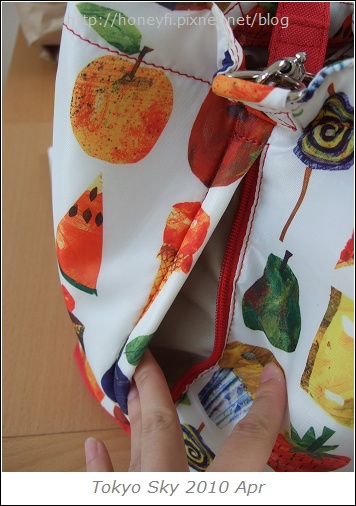 一個大包包外加尿布包和同色的防水尿布墊各一。我買得是他與設計師Eric Carle合作的系列HUNGRY,白底紅邊配上可愛手繪風的水果甜食,活潑大方又好配衣服,實品比在網頁上看到的好看,不枉我傷了好幾天的腦筋呀!