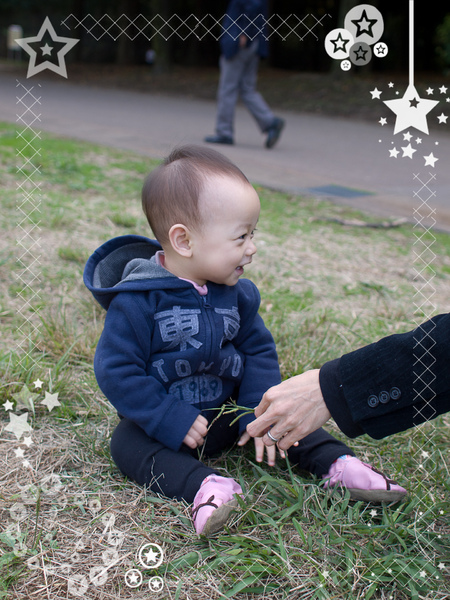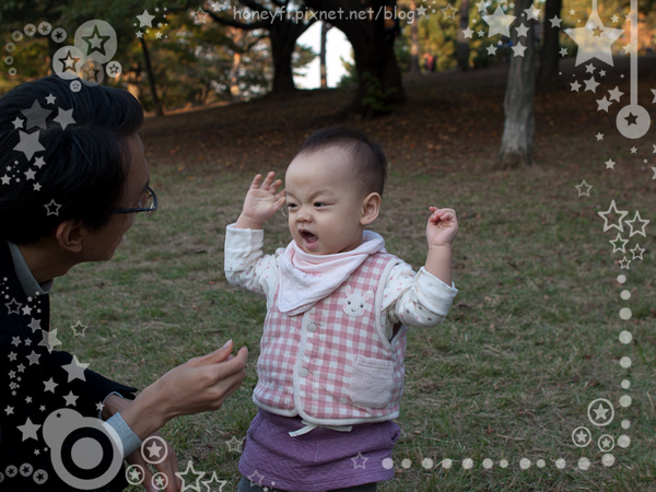 這個月開始帶她去公園玩,有時候是在草地上走、有時候在石板地上,她的活動量非常大,到公園去真的是剛剛好,若大的廣場可以來回走一兩圈,要帶她回家還會抗議呢。再配合上一週四天去兒童館玩,讓她的作息基本上都維持非常正常的狀況,雖然晚上還是小時2.3小時會醒來,不過我也習慣了,放棄掙扎~(笑)