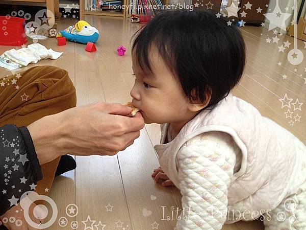 離乳食開始進入三餐階段,也開始會對食物有所喜好,像是不肯吃用白飯加水微波的"偷懶粥"、不吃市售的嬰兒食品和熟的水果等等,不過除此之外倒是沒有對什麼特殊的食材產生不喜歡的態度。平常比較喜歡吃粥、撕成小小塊直接塞到她嘴裡的麵包、或是蒸熟後切小塊的蔬菜,有時候後除了她自己的四倍周知外,還會搶我的白飯(我們家吃得比較軟)吃。